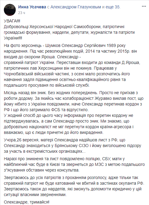 26 сентября матери Шумкова пришло письмо из России, что ее сын находится в Брянском СИЗО и ему сообщено о подозрении в участии в экстремистских организациях".