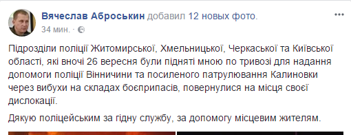 "Подразделения полиции Житомирской, Хмельницкой, Черкасской и Киевской областей, которые ночью 26 сентября были подняты мной по тревоге для оказания помощи полиции Винницкой области и усиленного патрулирования Калиновки из-за взрывов на складах боеприпасов, вернулись в места своей дислокации", - написал он.