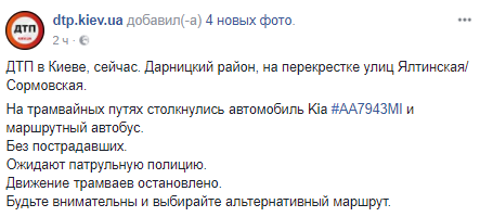 Как сообщают очевидцы аварии, на трамвайных путях столкнулись автомобиль и маршрутный автобус. "ДТП в Киеве. Дарницкий район, на пересечении улиц Ялтинская/Сормовская. На трамвайных путях столкнулись автомобиль Kia и маршрутный автобус", - говорится в сообщении.