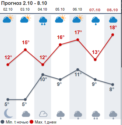 Ресурс Мeteoprog.ua обещает намного меньше дождливых дней, чем другие ресурсы. Осадки возможны 4 и 7 октября. Температура +12...+15 днем. В пятницу и воскресенье потеплеет до +18...+19.