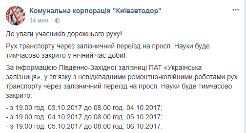 В Киеве на ночное время суток временно закроют движение транспорта через железнодорожный переезд на проспекте Науки из-за необходимости неотложного ремонта. Об этом в Facebook сообщает "Киевавтодор".