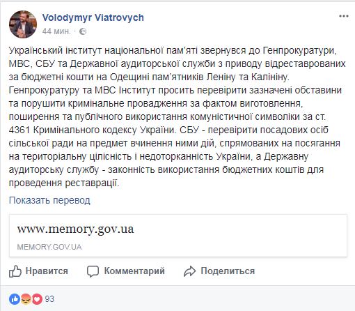 В отношении чиновников, которые отреставрировали в Одесской области памятники революционерам Владимиру Ленину и Михаилу Калинину, должно быть открыто уголовное дело.