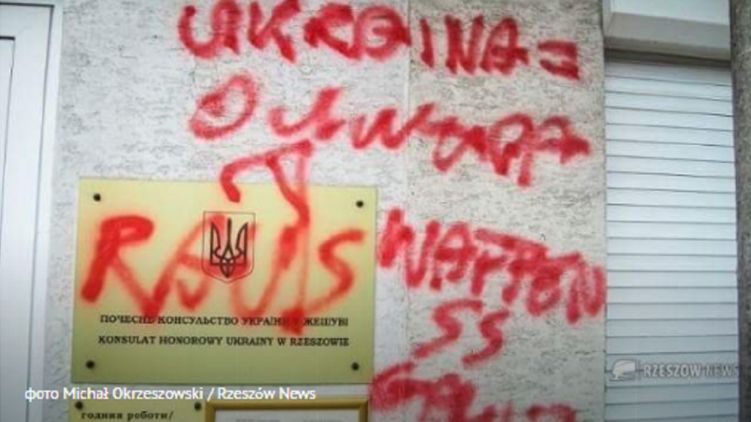 Как сообщала "Страна", в городе Жешув на юге Польши неизвестные исписали почетное консульство Украины надписями.  На здании консульства неизвестные вандалы написали на польском языке: "Украина = ОУН-УПА", "Waffen SS Galitzien", у герба Украины нарисовали виселицу и надпись Raus (на немецком языке "долой"), свастику и надпись на русском "имеется".