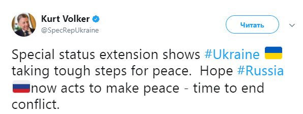 "Продление специального статуса показывает, что Украина предпринимает жесткие шаги для мира. Надеюсь, теперь Россия будет действовать, чтобы наступил мир - пришло время положить конец конфликту", - написал Волкер.