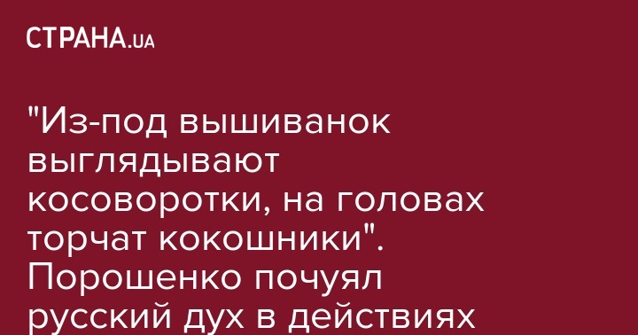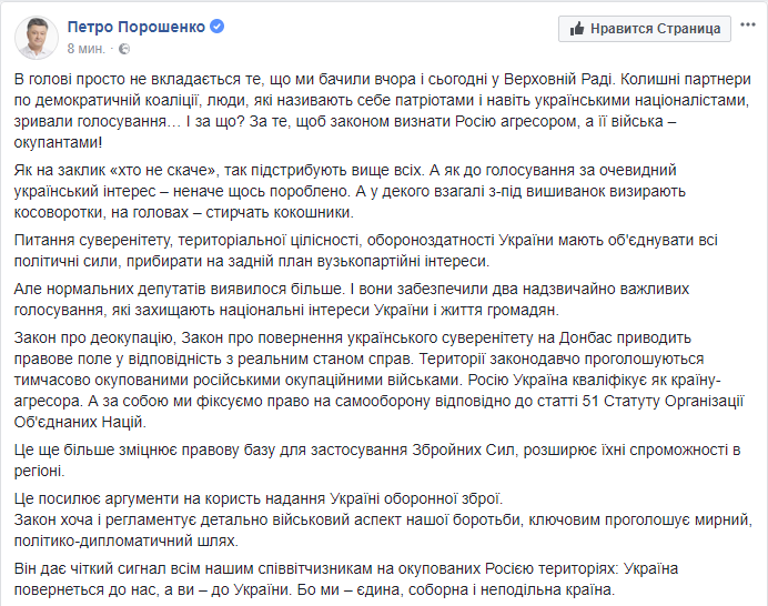 "В голове просто не укладывается то, что мы видели вчера и сегодня в Верховной Раде. Бывшие партнеры по демократической коалиции, люди, которые называют себя патриотами и даже украинскими националистами, срывали голосования ... И за что? За то, чтобы законом признать Россию агрессором, а ее войска - оккупантами! Как призыв "кто не скачет", так подпрыгивают выше всех. А как дело за голосованием за очевидный украинский интерес - как будто порча наложена. А у некоторых вообще из-под вышиванок выглядывают косоворотки, на головах - торчат кокошники", - критикует президент своих оппонентов.