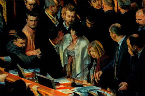 Ставшую известной вчера фотографию из зала Верховной Рады, где толпа депутатов, блокировавшая трибуну, окружила опустившую глаза Татьяну Черновол (автор фото  - Анна Грабарская), мы прогнали через фильтры известной программы Prizma, которая стилизует фото под картинки знаменитых художников, виды и стили живописи и графики.