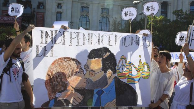 В каталонском городе Барселона также собралась демонстрация с призывом к политическому диалогу. Люди держат плакаты с надписями: "Испания является лучшей, чем ее лидеры" и "Давайте поговорим".
