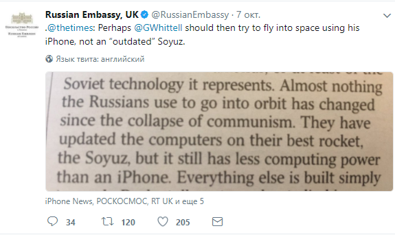 В последствии утверждение Уиттелла о том, что у ракеты-носителя "Союз" "мощность компьютерных систем меньше, чем у iPhone" прокомментировали в посольстве России в Великобритании.