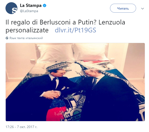 По информации издания, бывший глава итальянского правительства подарил президенту России выполненный по специальному заказу пододеяльник.