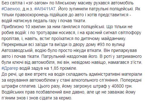 "Кстати, это уже третий раз на водителя составляют административные материалы за управление автомобилем в состоянии алкогольного опьянения. Предыдущие штрафы оплатил. На этот раз, ему грозит штраф в размере 40 800 грн", - добавили в группе.