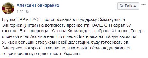 "Группа Европейской народной партии в ПАСЕ проголосовала в поддержку Эммануэлиса Зингериса (Литва) на должность президента ПАСЕ. Он набрал 37 голосов. Его соперница - Стелла Кириакидес - набрала 31 голос. Теперь слово за всей ассамблеей. Но шансы Зингериса на победу выросли", - отметил Гончаренко.