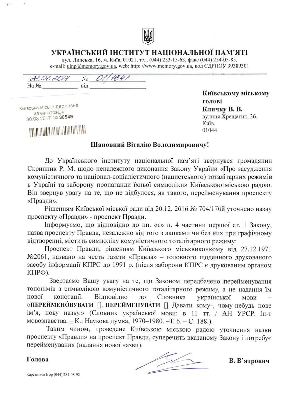 Писатель и краевед Михаил Кальницкий обратил внимание на официальное письмо Украинского института национальной памяти на имя городского головы, о том, что Киевсовет должен переименовать"Проспект Правды".
