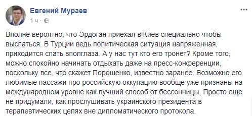 Евгений Мураев, депутат: " Вполне вероятно, что Эрдоган приехал в Киев специально чтобы выспаться. В Турции ведь политическая ситуация напряженная, приходится спать вполглаза. А у нас тут кто его тронет? Кроме того, можно спокойно начинать отдыхать даже на пресс-конференции, поскольку все, что скажет Порошенко, известно заранее. Возможно, его любимые пассажи про российскую оккупацию вообще уже признаны на международном уровне как лучший способ от бессонницы. Просто еще не придумали, как прослушивать украинского президента в терапевтических целях вне дипломатического протокола".