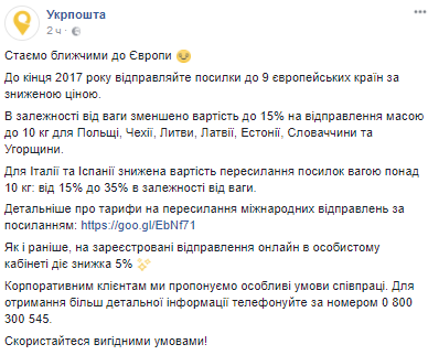 Государственный оператор почтовой связи "Укрпочта" временно понизил стоимость отправлений посылок в Польшу, Чехию, Литву, Латвию, Эстонию, Словакию и Венгрию, а также - в Италию и Испанию. Об этом говорится на странице оператора почтовой связи в Facebook.