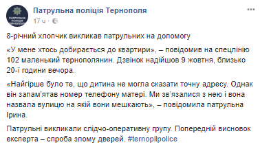 В понедельник, 9 октября, в Тернополе 8-летний мальчик, оставленный родителями дома, предупредил квартирное ограбление. Об этом сообщает пресс-служба полиции Тернополя.