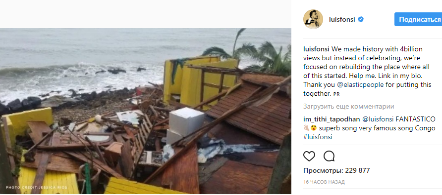 "Мы вошли в историю, набрав четыре миллиарда просмотров, но вместо того, чтобы праздновать, мы сосредоточились на восстановлении места, где все начиналось", - написал он, говоря о том, что Пуэрто-Рико пострадало от разрушительного урагана.
