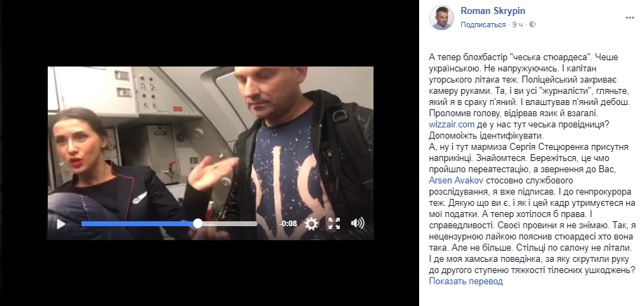 "А теперь блохбастир "чешская стюардесса". Чешет на украинском. Не напрягаясь. И капитан венгерского самолета тоже. Полицейский закрывает камеру руками... Wizzair.com, где у нас тут чешская проводница? Помогите идентифицировать", - написал Скрыпин.