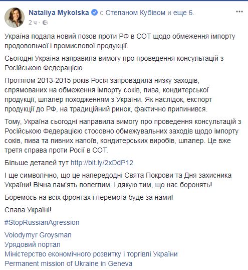 "Украина подала новый иск к РФ в ВТО относительно ограничения импорта продовольственной и промышленной продукции. Сегодня Украина направила требование о проведении консультаций с Российской Федерацией", - написала она.