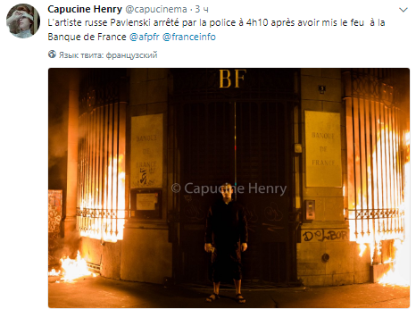 Фотографию Павленского на фоне горящего банка обнародовал в Twitter фотограф Капуцин Анри.