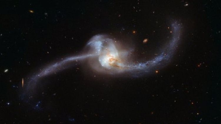 Космический телескоп Hubble сфотографировал столкновение двух галактик в созвездии Рака, которые "рассыпались" на два ярких и длинных хвоста из миллионов звезд.