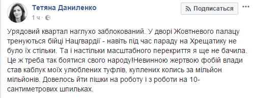 "Во дворе Октябрьского дворца тренируются бойцы Нацгвардии - даже во время парада на Крещатике не было их столько. Да и столь масштабного перекрытия я еще не видела. Это же надо так бояться своего народа! Невинных жертв фобий власти стал каблук моих любимых туфель, купленных когда-то за миллион миллионов. Пришлось идти пешком на работу и с работы на 10-сантиметровых шпильках", - написала она.