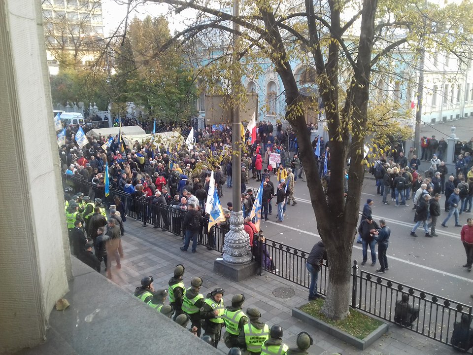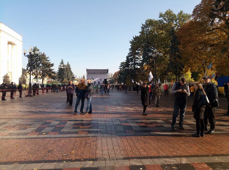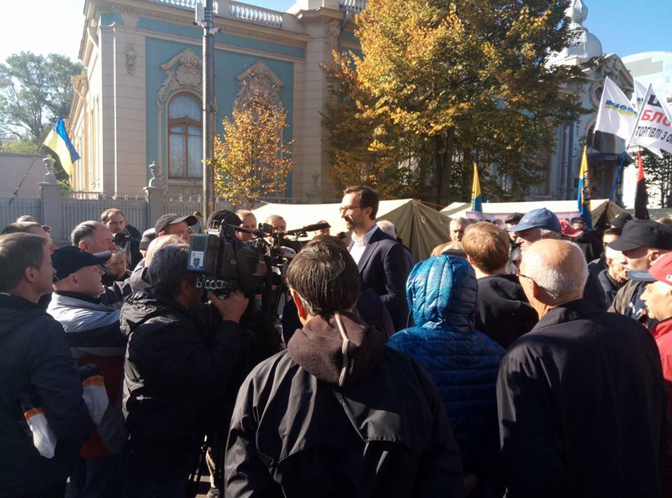 Саакашвили прибыл со стороны Европейской площади в окружении нескольких десятков своих сторонников. Он призвал завтра не выпускать депутатов из Рады, пока те не проголосуют за "волю народа" и раскритиковал Петра Порошенко за то, что тот не принял нардепов-ходоков.