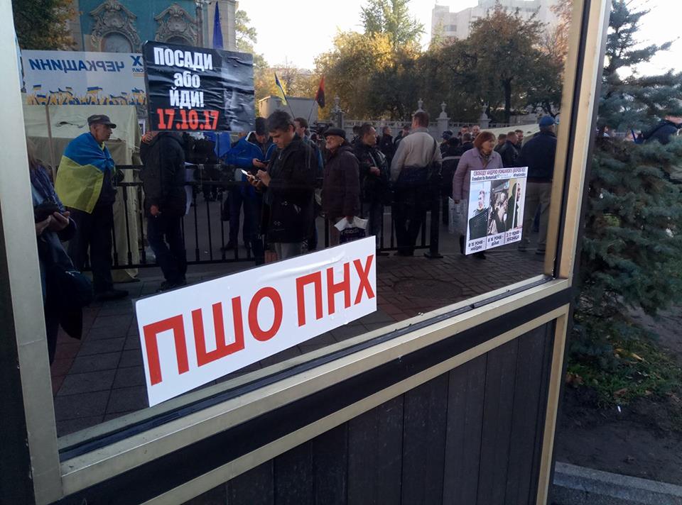 9:43  Ого, а это что-то новое. Слов "ПНХ" в отношении Порошенко еще никто не употреблял. По крайней мере, так близко к Банковой. На заднем плане маячат зеленые флаги "Самопомощи".