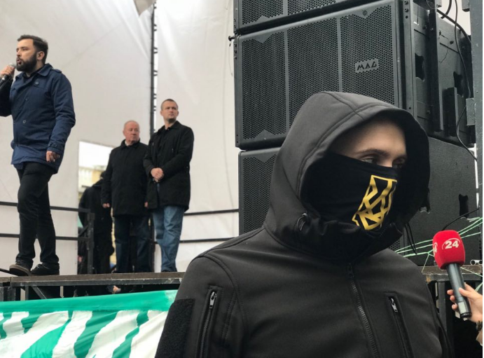 Перед сценой стоит кордон из активистов "Национального корпуса". Они в масках и не подпускают никого к конструкции ближе чем на метр.