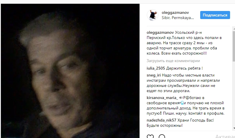 "Усольский район. Пермский край. Только что здесь попали в аварию. На трассе сразу две ямы из одной торчит арматура, пробили оба колеса. Всем ехать осторожно!", - написал Газманов.