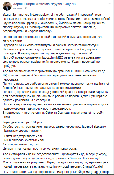 "Внимание! По имеющейся информации, вечно смущен и нервный "хор Венских мальчиков" во главе с "дирижером" Гришиным (Семен Семенченко - ред.), с очень миролюбивой и очень набожной фракции "Самопомощь", вероятно намерены осуществить попытку штурма ВР с использованием взрывчатых пакетов. Наверное, рассчитывают на "эффект толпы". Правоохранители сохраняют спокойствие и холодный ум, но готовы к любым вызовам", - написал он.