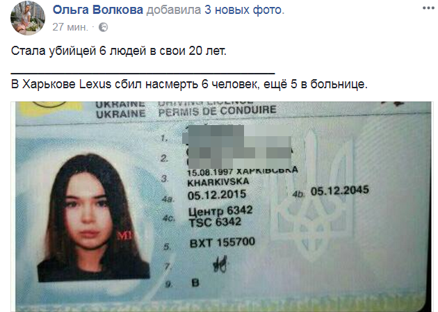 "Девушка-водитель Лексуса, который убил 6 людей в Харькове - студентка 3 курса социологического факультета университета им. Каразина, кафедра рекламы и пиара, - пишет у себя в ФБ харьковский юрист Алексей Романов. - Не обвиняйте ее со старта. Ее машину ударил в бок тяжелый Туарег. А там водитель непростой. Поэтому гонят волну на нее. Так всем проще".