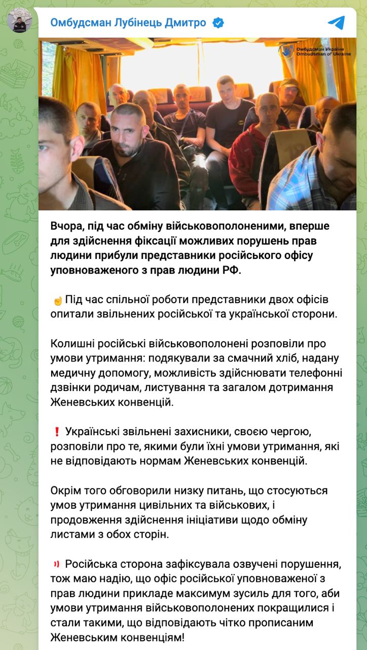 12.01 В ходе вчерашнего обмена пленными впервые прибыли представители российского омбудсмена и зафиксировали озвученные Украиной нарушения содержания украинских пленных в РФ.