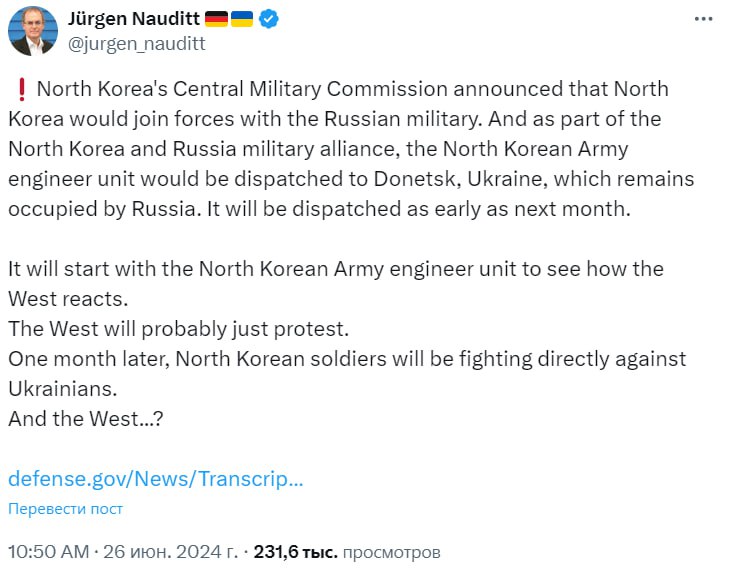 В Пентагоне уже прокомментировали информацию о возможной отправке северокорейских войск в Украину для их участия в войне, обозначив, что "за этим определенно стоит следить".
