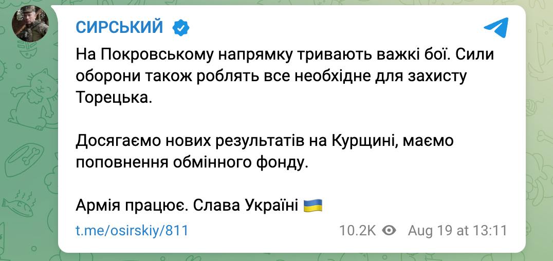 13.21 На Покровском направлении продолжаются "тяжелые бои", заявляет главком Сырский.