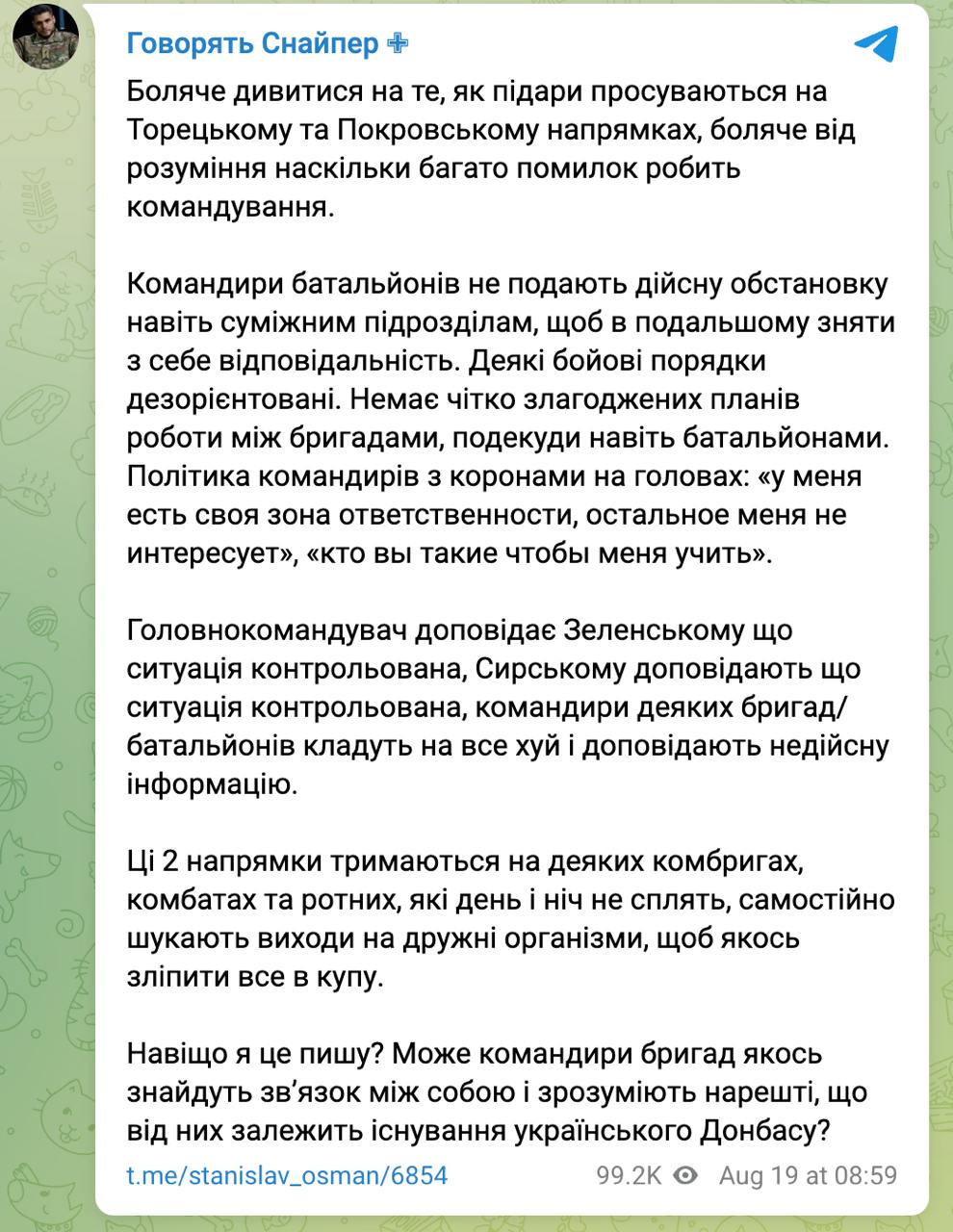 По его информации, "командиры некоторых бригад/батальонов кладут на все х@й и докладывают недействительную информацию", дальше по цепочке Сырскому докладывают, что ситуация контролируемая, а он это докладывает Зеленскому.