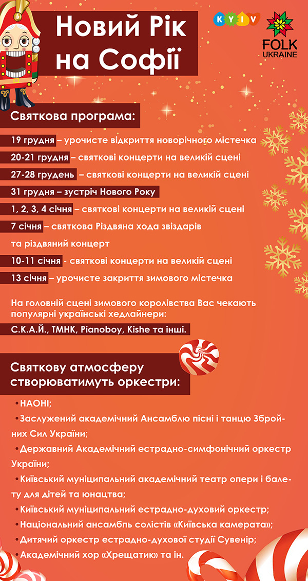 В Киеве на Софийской площади 19 декабря выступят С.К.А.Й., ТМНК, Pianoboy и Kishe. Кроме того, будут подготовлены новогодние мастер-классы и аттракционы. Об этом сообщает пресс-служба КГГА.