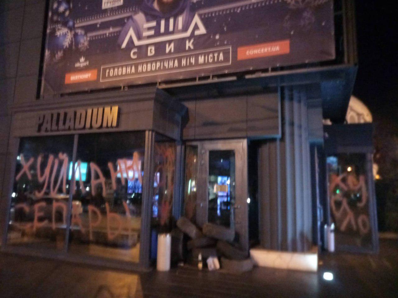 Также они принесли под здание клуба автопокрышки и написали на окнах заведения "ху@ланы, сепары" и "сепар-клуб закрыт".