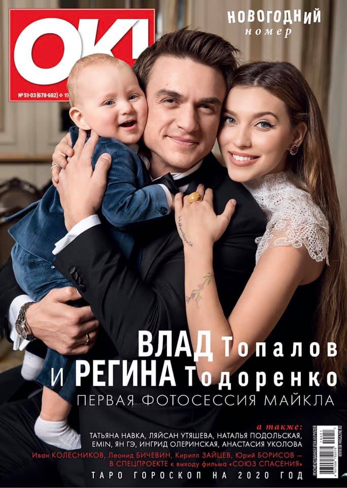 Звездные родители певец Влад Топалов и певица и телеведущая Регина Тодоренко вместе со своим сыном Майклом, которому 5 декабря исполнился год, появились на обложке глянцевого журнала. Об этом сообщила PR-директор Регины Тодоренко Екатерина Примина и опубликовала на своей странице в соцсети фото обложки глянца "Ок!".