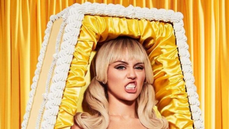 Так, в кадре 27-летняя исполнительница позирует обнаженной, скрестив руки на груди и изображая вампирский оскал. При этом нижняя часть ее тела прикрыта букетом цветов. Сайрус засняли в гробу с шелковой обивкой золотого цвета.