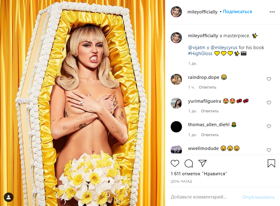 Майли Сайрус выставила фото, где она лежит голая в гробу. Фото: instagram.com