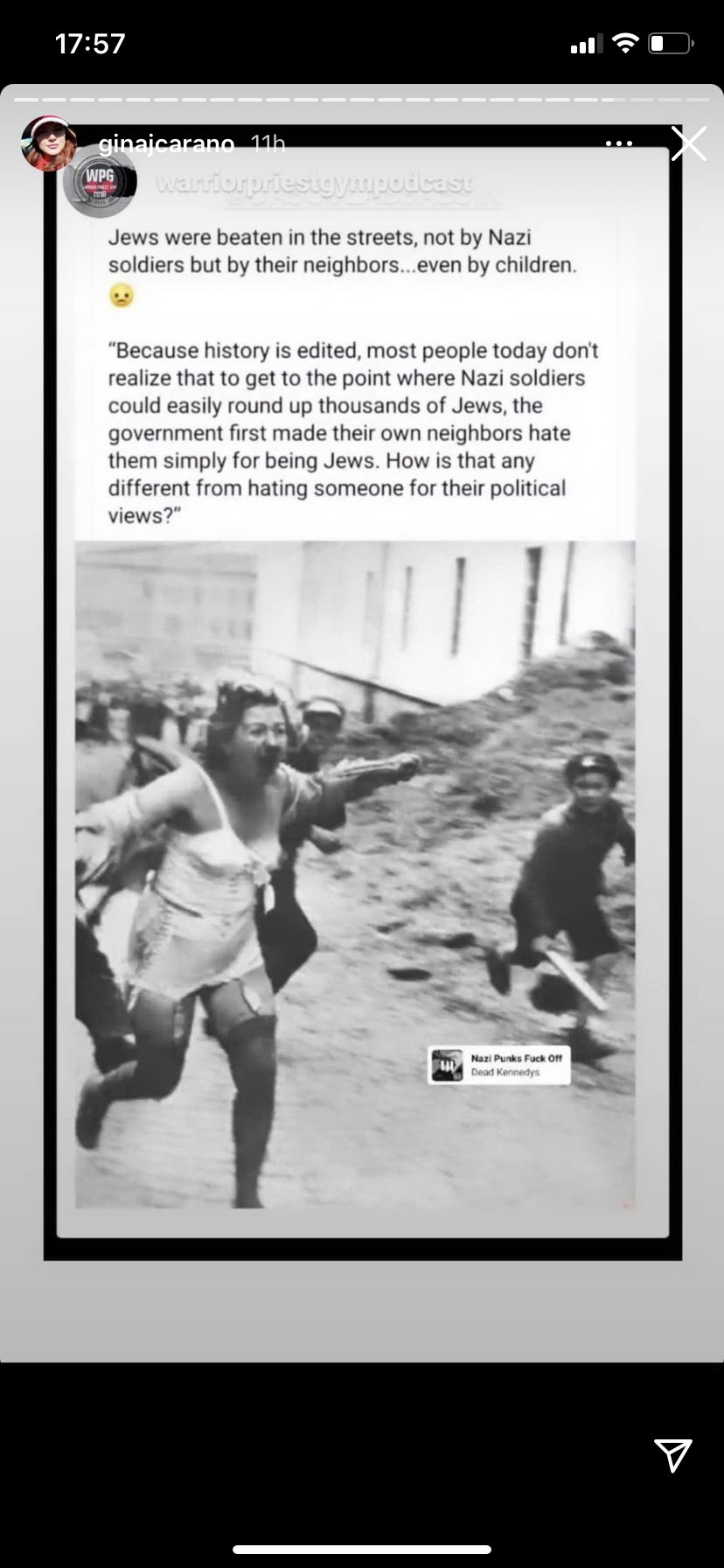 Скандал разразился после недавнего перепоста Карано в сторис Instagram, где современную политическую ситуацию в США сравнили с нацистской Германией.