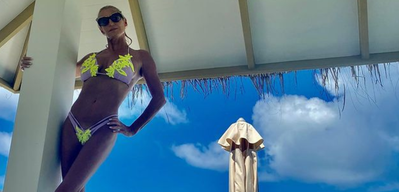 Также балерина продемонстрировала свою изящную фигуру в фиолетовом купальнике и ярко-желтым кружевом.