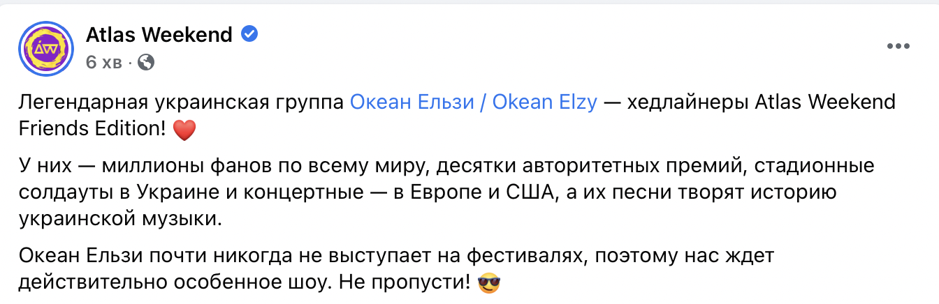 "Легендарная украинская группа "Океан Эльзы" - хедлайнеры Atlas Weekend Friends Edition! У них - миллионы фанов по всему миру, десятки авторитетных премий, стадионные солдауты в Украине и концертные - в Европе и США, а их песни творят историю украинской музыки. Океан Эльзы почти никогда не выступает на фестивалях, поэтому нас ждет действительно особенное шоу. Не пропусти!" - говорится на странице мероприятия в Facebook.