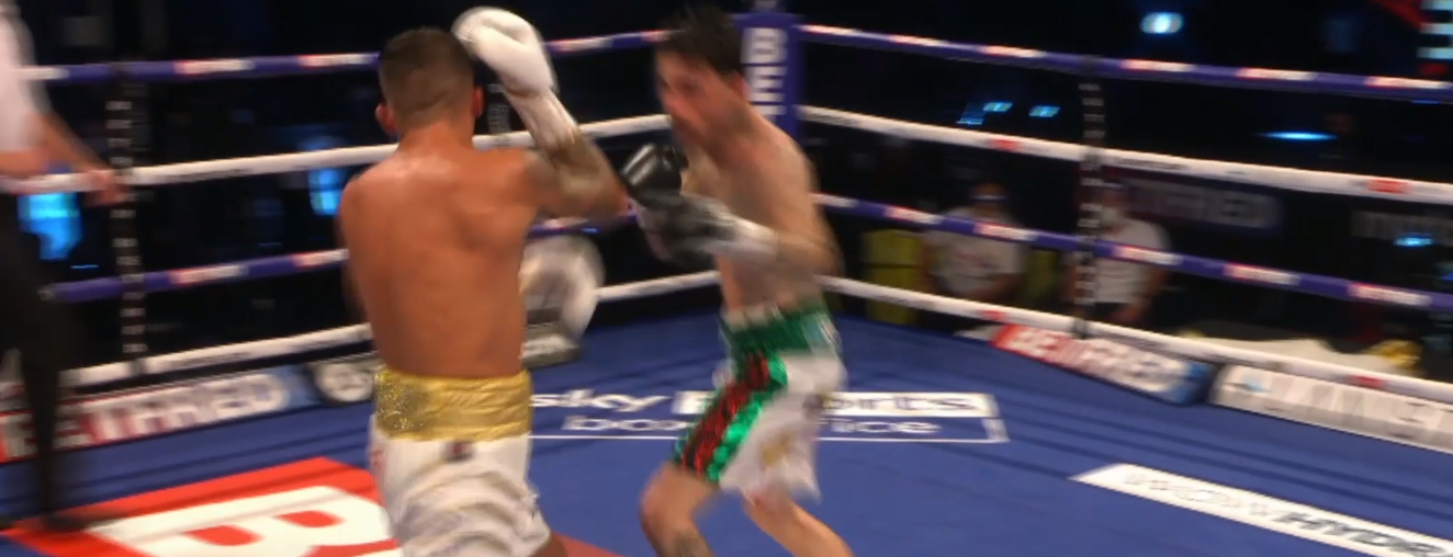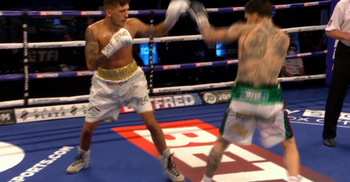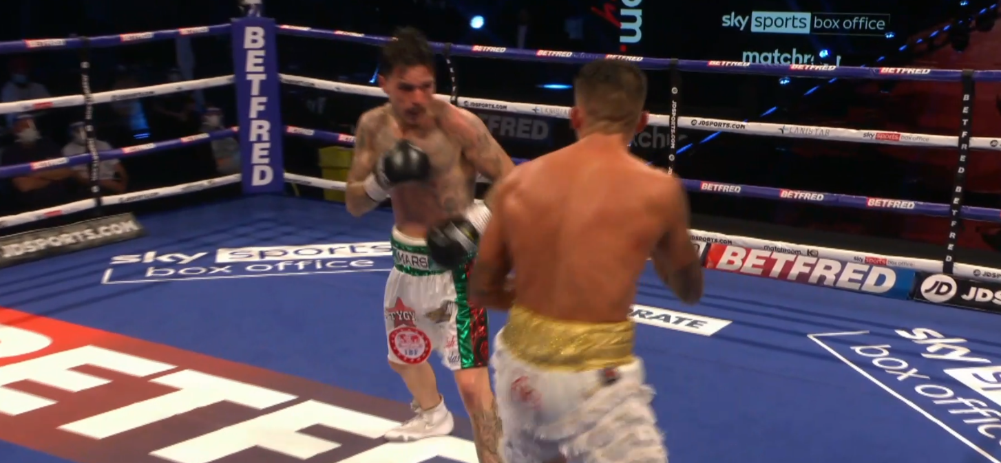 0:31 В целом пока визуальное преимущество у Джорджа Камбососа-младшего, но против него на ринге британский боксёр. А поединок проходит в Лондоне...