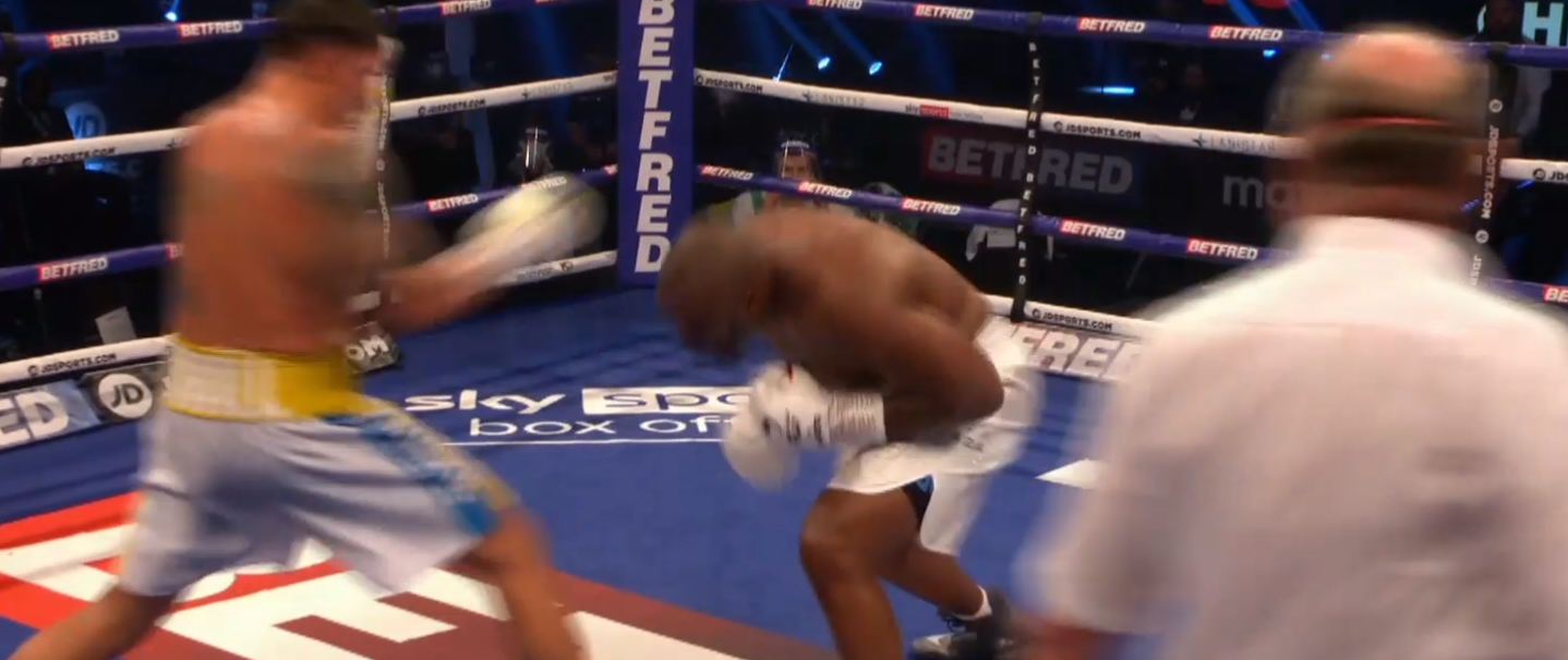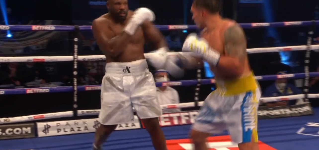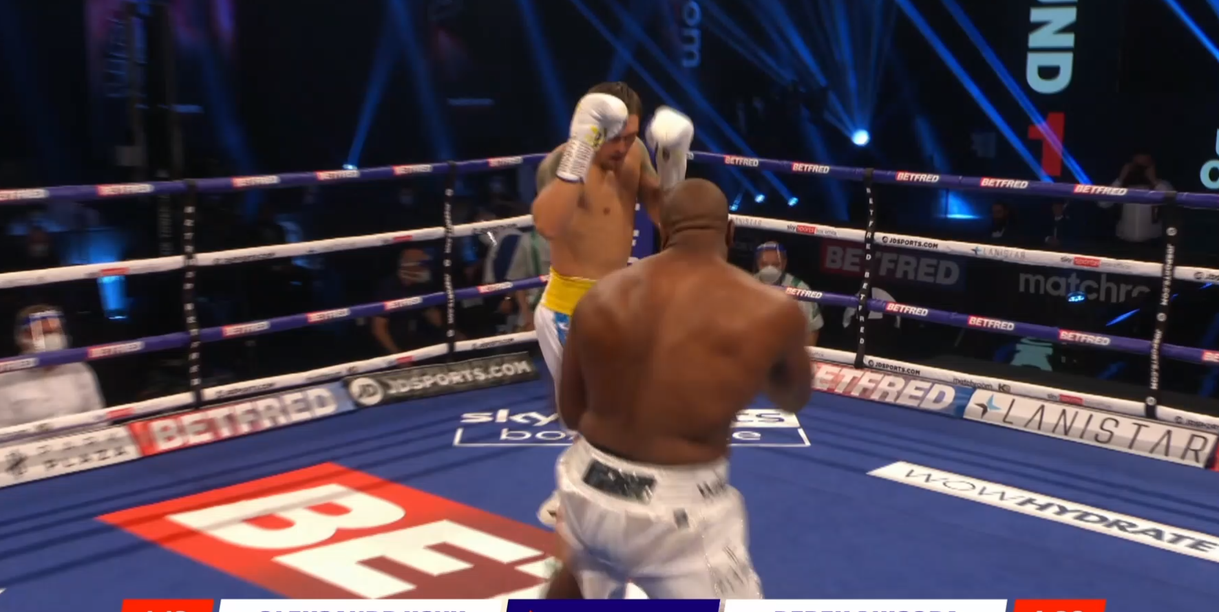 1:20 В третьем раунде Чисора продолжил атаковать и один удар очень красиво промазал. Александр увернулся и Дерек чуть не полетел на ринг из-за своей же силы. Скоро он должен устать, так как гораздо массивнее Александра