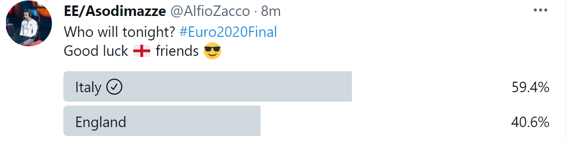21:07 Опрос в стиле "кто за кого" на текущий момент выглядит так, но игра-то будет на лондонском "Уэмбли" с английскими правилами въезда даже для болельщиков...Италии будет непросто из-за традиционно оглушительной поддержки местных трибун.