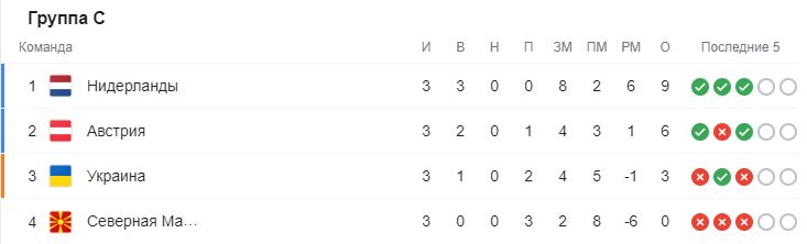 На групповом этапе сборная Украины попала в группу С вместе со сборными Нидерландов, Австрии и Северной Македонии. Результаты встреч нашей сборной были такими: