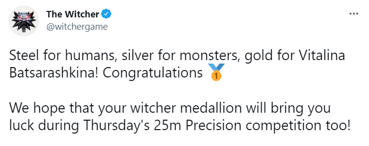 "Сталь для людей, серебро для монстров, золото для Виталины Бацарашкиной! Поздравляем! Мы надеемся, что медальон ведьмака принесёт вам удачу и на соревнованиях по стрельбе с 25 метров в четверг!", - пишут в соцсети.
