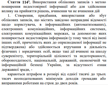 За текстом проекту, за створення, придбання, використання або збут облікових записів, що містять свідомо неправдиві відомості щодо користувача, в інформаційних (автоматизованих) електронних, комунікаційних, інформаційних системах, за допомогою яких поширюється недостовірна інформація (у тому числі від імені інших осіб, (причетність яких до опублікованої інформації не встановлено), або здійснюється втручання у діяльність фізичних та юридичних осіб, якщо такі дії вчинені на шкоду суверенітету, територіальній цілісності та недоторканності, обороноздатності, національній, державній, економічній та інформаційній безпеці України, за відсутності ознак держзради, - загрожує штраф від 1 до 3 тисяч неоподатковуваних мінімумів або виправні роботи до 2 років.