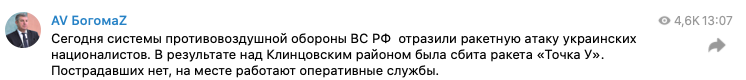 Губернатор Брянської області Олександр Богомаз заявив, що російські ППО збили ракету "Точка У" у небі над Клінцовським районом.